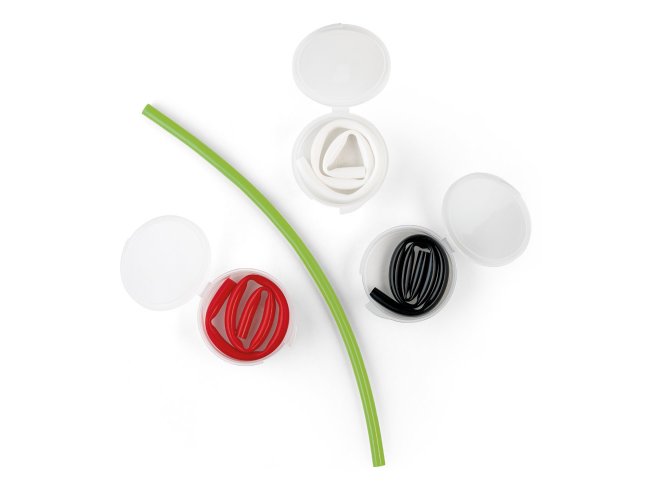 Canudo reutilizável e dobrável em 100% silicone. O canudo é acompanhado de uma caixa PP branca e translúcida com acabamento fosco. Canudo : ø7 x 250 mm | Caixa: ø55 x 20 mm
