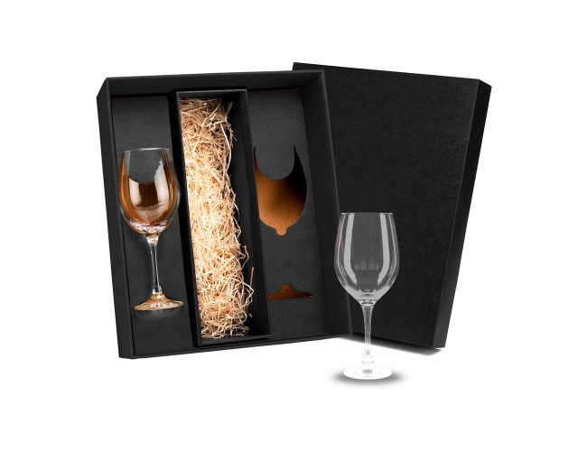 Conjunto composto por duas taças de vidro para vinho, com compartimento interno destinado à acomodação de uma garrafa (não inclusa). Indicado para ações promocionais, eventos corporativos e campanhas de relacionamento.