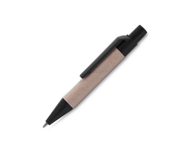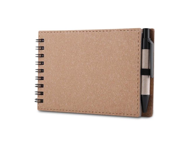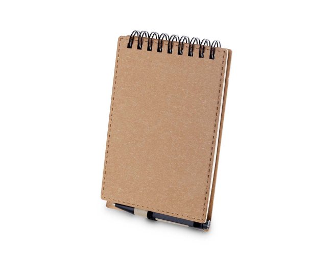 Mini Caderno com capa em papelão e encadernação espiral wire-o, 70 folhas sem pauta em 70g/m². Acompanha caneta confeccionada em papelão reciclado com detalhe em plástico.